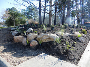 Major improvement of the current entryway occurred in 2015 in response to needing landscaping around the new digital sign and wanting a much more inviting street presence. The work was funded in two phases by grants from the Foundation. Tributary Land Design was contracted for the design and its installation and lots of volunteers helped put in plants once the site was prepared. The goals for the project were many – simple, low maintenance, drought resistant, native plants to the degree possible, looking good year round, deer resistant and fitting in with other design elements on the property, including the new sign.